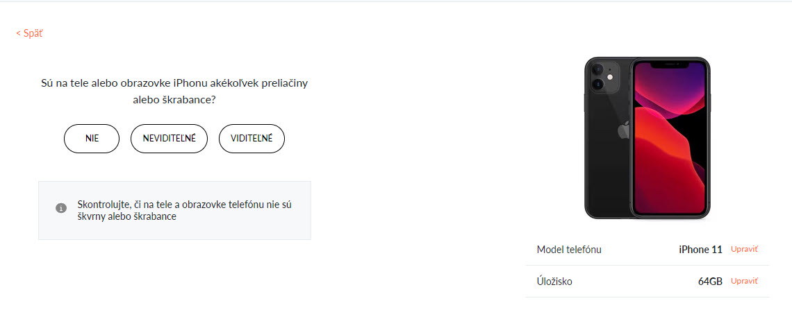 Vyskúšali sme vyplniť formulár pre telefón iPhone 11, ktorý by bol vo veľmi zachovalom stave len s bežnými škrabancami na tele a dostali sme k sume 295 eur.