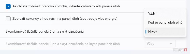 Jednou z najviditeľnejších zmien a najmä skutočne žiadanou funkciou bolo obnovenie nezoskupovania tlačidiel na Paneli úloh. Používatelia majú opäť možnosť vybrať si, akou formou sa budú tlačidlá zoskupovať, či vždy, len pri plnom paneli úloh alebo nikdy.