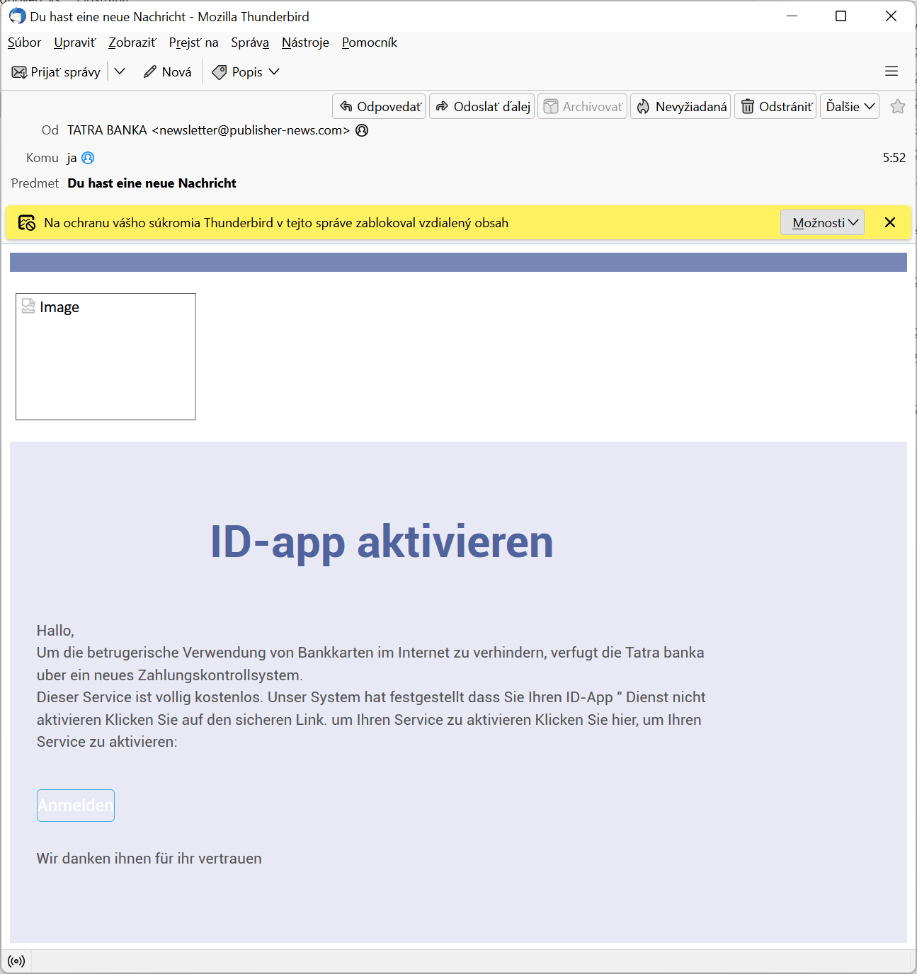 Keď si všimnete informácie na obrázku, emailová adresa vôbec nekorešponduje so skutočnou adresou Tatra banky. Email z tejto adresy je naozaj podozrivý. Jeho źnenie v preklade znamená: