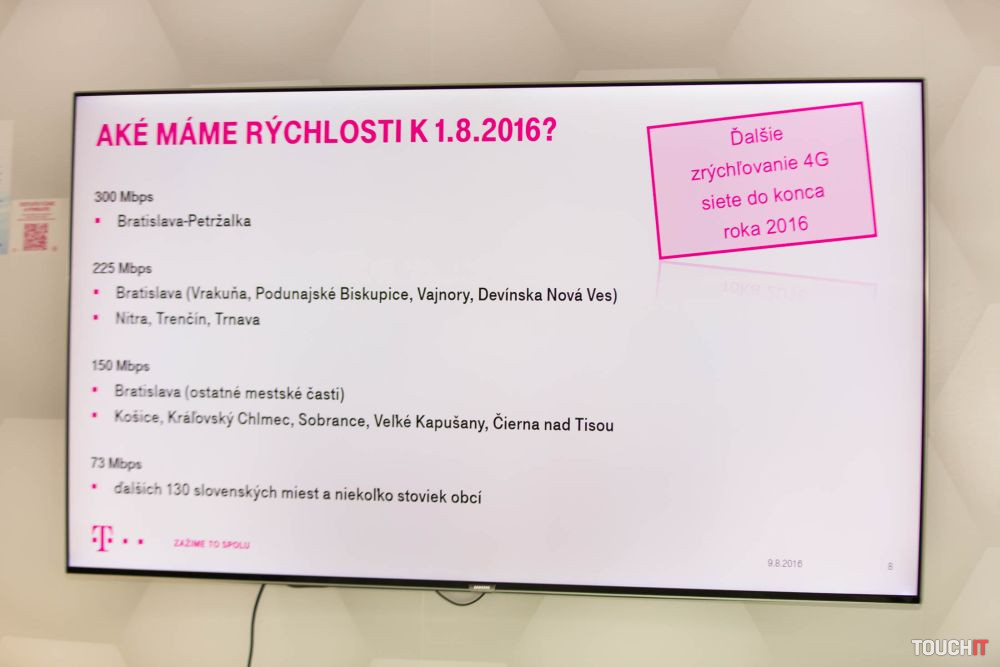 LTE-A v sieti Telekomu zvládne rýchlosť až 900 Mbps Operátor na tlačovej konferencii takisto predviedol verejný test 4G siete s rýchlosťou až 900 Mbps. Využil pritom zaradenia s modemom Qualcomm® Snapdragon™ X16 LTE, ktorý dokáže prijímanť dáta z viacerých pásiem súčasne. Pri teste bola aplikovaná schopnosť 3x carrier aggregation (s dvomi kanálmi na B7 s 256QAM/4×4 MIMO a jedným na B3 s 256QAM/2×2 MIMO konfiguráciou). Demo sa uskutočnilo v reálnych podmienkach na Magio pláži v Bratislave pri použití 40 MHz v pásme 2600 MHz a 10 MHz v pásme 1800 MHz. Infraštruktúru pre test dodala spoločnosť Ericsson. Slovak Telekom je prvý operátor na Slovensku, ktorý realizoval testovaciu prevádzku LTE-A siete s rýchlosťou do 900 Mbps. Z používateľského hľadiska je táto rýchlosť aktuálne takmer nedosiahnuteľná, pretože vyžaduje zariadenie s podporou štandardu LTE-cat16. Smartfóny s podporou tohto štandardu sa dostanú na trh najskôr až budúci rok. Aktuálne najlepšiu výbavu ponúka Samsung Galaxy Note 7, ten podporuje štandard LTE-cat12. Prečítajte si aj:Slovak Telekom opäť získal ocenenie Best in Test za mobilné siete na Slovensku. Pozrite si výsledky a metodiku merania