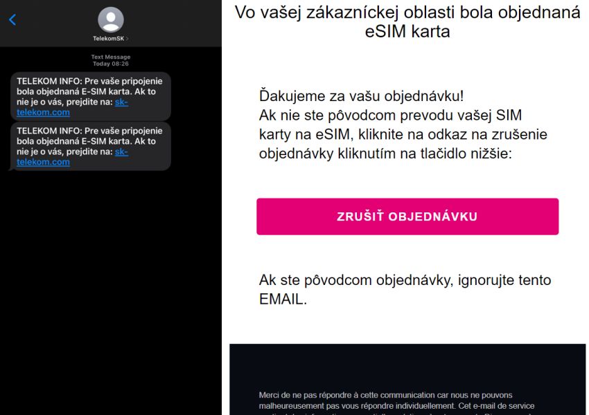 Zákazníci sa mohli a naďalej sa môžu stretnúť s podvodnou komunikáciou, ktorá sa tvári, že je od spoločnosti Slovak Telekom, ktorá ich informuje, že si objednali eSIM kartu. Pre potvrdenie alebo zrušenie tejto objednávky musia kliknúť na odkaz v tele e-mailu alebo SMS správy, ktorá im bola doručená.