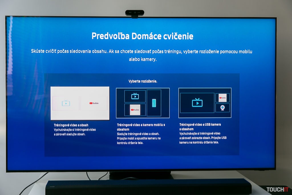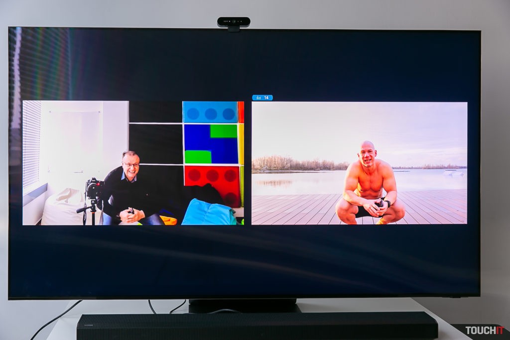 Špecialitou je potom pripojenie USB webovej kamery k televízoru čím získate ďalšie využitie napr. pri komunikačných programoch s tým, že vašich partnerov vidíte na obrovskom displeji televízora. Samsung v aplikáciách pre televízor podporuje napr. Google Duo. Výhodou je, že v tomto prípade kamera automaticky sleduje vašu tvár a zobrazení ste stále v ideálnom uhle. Ale cez zrkadlenie pokojne môžete používať na komunikáciu napr. Teams po pripojení notebooku alebo smartfónu.