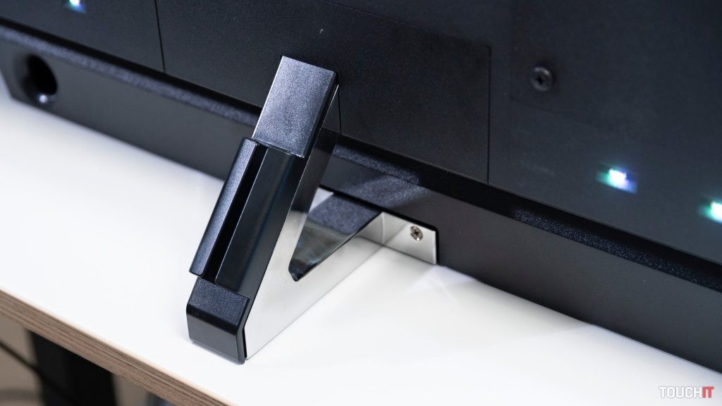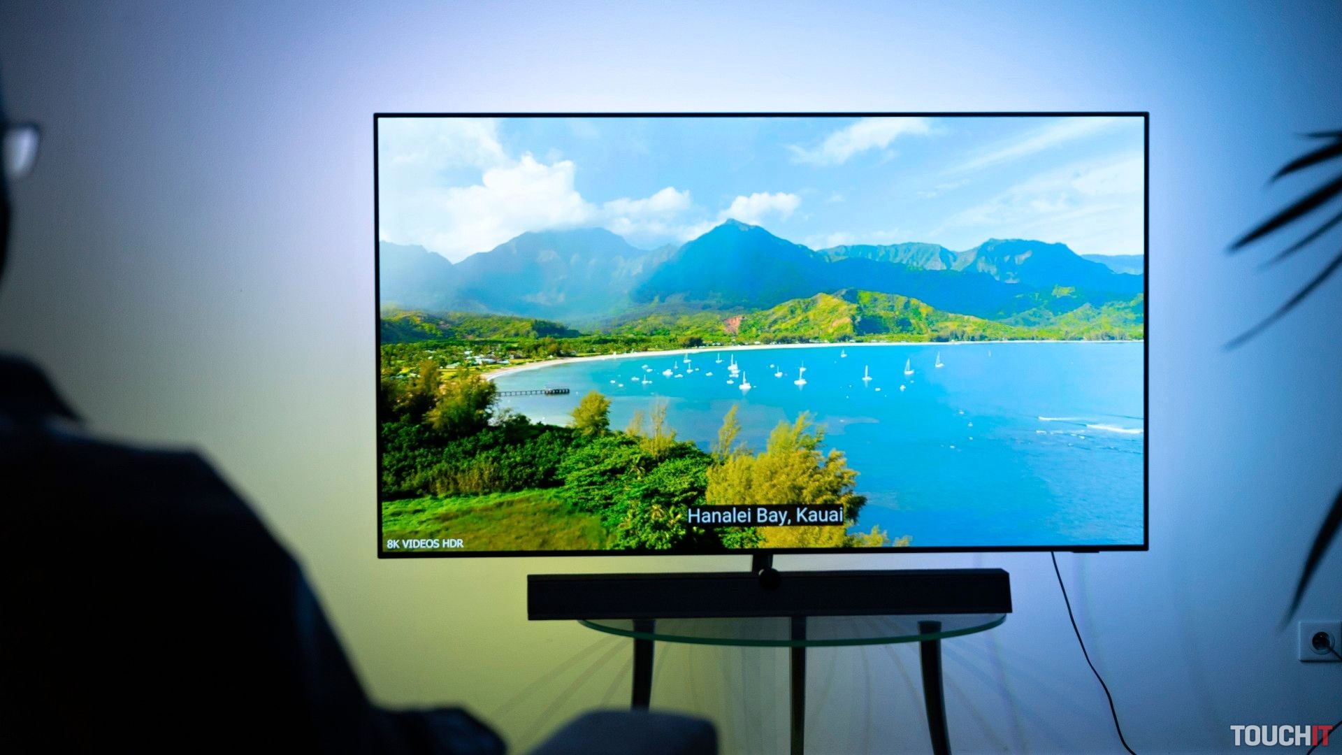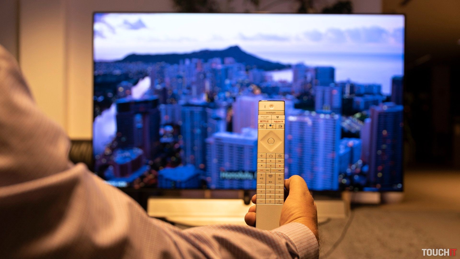 Testovali sme ho v 65-palcovom vyhotovení a je to veľký televízor. Dá sa umiestniť aj stenu, veľmi dobre vyzerá pri umiestnení na stôl. Pôsobí vtedy, ako keby sa vznášal vo vzduchu. Ihneď si všimnete integrovaný soudbar s ikonickým výškovým reproduktorom a tiež zaujímavé diaľkové ovládanie. To je pomerne dosť veľké, sú na ňom priame tlačidlá na Netflix, Prime Video a Rakuten TV. Dobre sa drží v ruke, hlavne jeho zadá časť pôsobí v ruke príjemným dojmom.