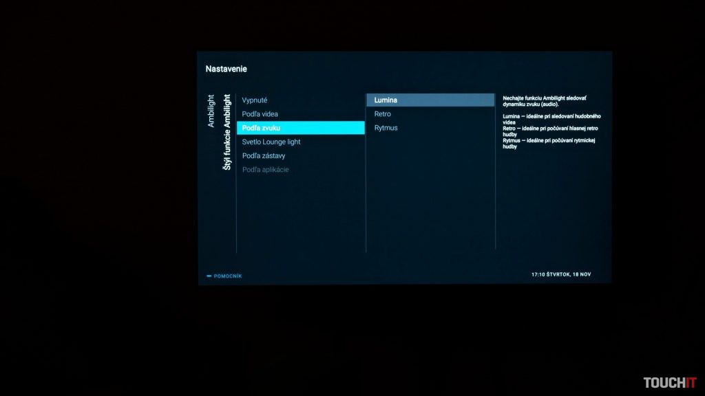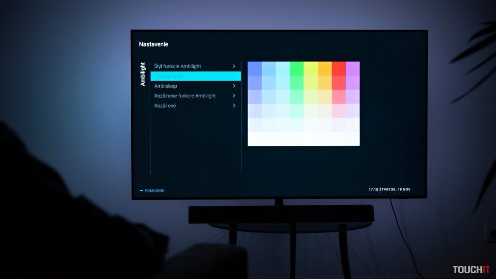 My sme používali nastavenie, kedy Ambilight vytváral farby, ktoré zodpovedajú obsahu na obrazovke a takto sa vlastne ešte viac rozširuje veľkosť zobrazovaného obrazu. Môžete ho ale použiť aj na živé osvetlenie v obývačke (biele, červené, modré) napr. na zlepšenie nálady pri filmoch a hrách.