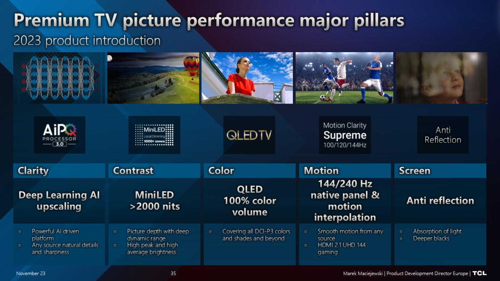 Vďaka technológii Quantum Dot dokázal tento model zobraziť viac ako miliardu farieb a pokryť 98 % farebného priestoru DCI-P3. Nový model je vybavený procesorom AiPQ 3.0. V jeho výbave sú už aj algoritmy umelej inteligencie od TCL určené na vylepšenie obrazu a zvuku. Výsledkom je optimalizácia čistoty obrazu a kontrastu. Procesor s umelou inteligenciou sa využíva aj na prepočet do 4K rozlíšenia. Ako sme sa dozvedeli na prezentácii, má to stále svoj význam, napr. pre Netflix si používatelia predplácajú najčastejšie najnižší balík, ktorý neponúka obsah v 4K a robia to aj vtedy, keď si domov kúpili 4K televízor. Účinný upscaling na 4K rozlíšenie tak príde vhod.