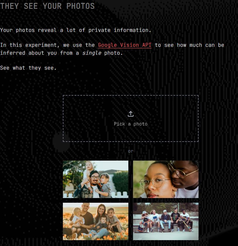 Túto tézu si môžete v praxi overiť vďaka experimentálnemu nástroju s názvom Google Vision API. Ide o projekt, ktorý má ukázať, čo všetko o nás prezrádzajú fotografie prečítaním ich objektov a kompozície prostredníctvom AI. Nájdete ho na adrese TheySeeYourPhotos.com.