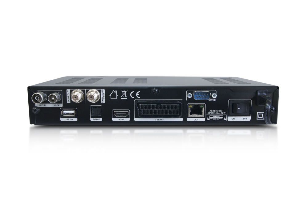 Na prednom paneli nájdete len tri tlačidlá – dve na prepínanie kanálov a jedno na uspatie zariadenia. Okrem toho je tu pod krytkou port na pripojenie napr. USB kľúča hlavne na prehrávanie údajov z neho – fotiek, videí či hudby. Pod touto krytkou je tiež priestor pre kódovaciu kartu, tentoraz už aj s nálepkou určujúcou správnu orientáciu karty pri jej vkladaní. Podporovaný je aj CI slot, čo využijete hlavne pri nových kartách Skylink.