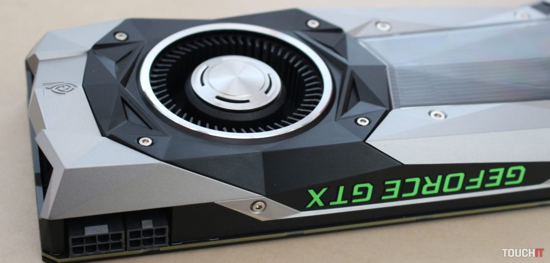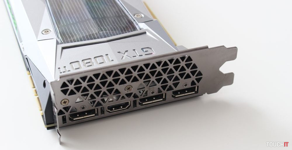 V prednej časti chladiča nesmie chýbať typové označenie, mriežka pre výstup ohriateho vzduchu je dostatočne široká a prúdu vzduchu tak bude klásť aspoň o čosi nižší odpor. Mriežka je väčšia aj vďaka tomu, že medzi obrazovými výstupmi v porovnaní s GTX 1080 chýba DVI port. Tak či tak sú jeho dni zrátané a na modernej karte nám chýbať nebude. V prípade nutnosti je možné siahnuť po redukcii, v prípade testovanej Founders Edition sme našli jednu v balení. K dispozícii tak ostala trojica DisplayPort vo verzii 1.4 s maximálnym podporovaným rozlíšením 7680×4320 pri 60 Hz a jeden HDMI 2.0b port s podporou 4096×2160 pri 60 Hz.