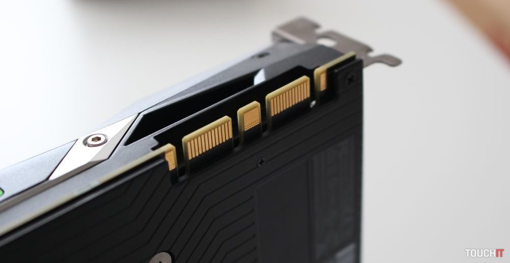 Na opačnom konci karty nachádzame konektory pre SLI mostík, podobne ako pri predchádzajúcich modeloch GTX 10xx v jeho poslednej verzii so zvýšenou priepustnosťou.