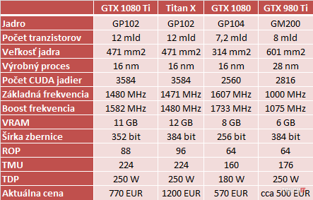 Ako sme už spomenuli, GTX 1080 Ti je postavená rovnako ako Titan X na čipe GP102 no nejde len o podtaktovanú verziu. Rozdielov je o čosi viac. GTX 1080 Ti má z 30 SM jednotiek odomknutých 28 a deaktivovaná je celá jedna časť jadra, konkrétne jedna na dvanástina. Neaktívny je tak blok ôsmich ROP, ktorých je 88 z celkovo 96, spolu s 256 Kb L2 cache a časti pamäťového radiča. Základná frekvencia je však 1480 MHz, s boostom ešte o 100 MHz viac. To je síce menej ako mala GTX 1080, lenže GTX 1080i má viac tranzistorov a výrazne vyšší počet CUDA jadier.