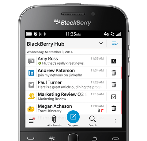 Silnou stránkou BB Classic je v tom, ako je zameraný na produktívnu prácu. Všetky kontá, ktoré do systému pridáte sa zobrazia v aplikácii Hub. Úplne všetko je tak na jednom mieste a rýchlo si na to zvyknete. Nielen preto je telefón veľmi dobre vnímaný vo firemnom prostredí. Je to aj vďaka možnosti šifrovať jeho obsah vrátane pamäťovej karty. Pri resete do výrobných nastavení sa údaje premažú tak, aby sa nedali obnoviť. Tento proces zaberie vyše desať minút, no tu je priorita otázka bezpečnosti.