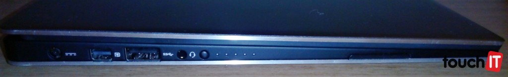 Konštrukčnou špecialitou je umiestnenie webovej kamery do spodnej ľavej časti rámu. Faktom je, že na horný okraj by sa šošovka optiky nezmestila. A ešte jeden dôležitý ergonomický údaj. Na tele nenájdete žiadne blikajúce LED diódy. Podsvietené tlačidlo na zapnutie ultrabooku vpravo hore má tlmené presvetlenie. Na boku je potom zostava piatich LED diód signalizujúcich kapacitu akumulátora po stlačení tlačidla vedľa nich.