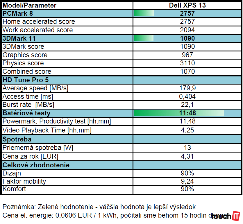 Vo výbave portov má vpravo čítačku SD kariet a jeden USB 3.0 port. Vľavo je to Mini DisplayPort, druhý USB 3.0 port a kombinovaný audio konektor. Testovali sme výdrž počítača a dosiahli sme čas 11:48 hod. To je skutočne slušný čas a aj pri náročnejšom používaní sa časom osmelíte a budete nosiť XPS 13-tku bez napájacieho adaptéra.