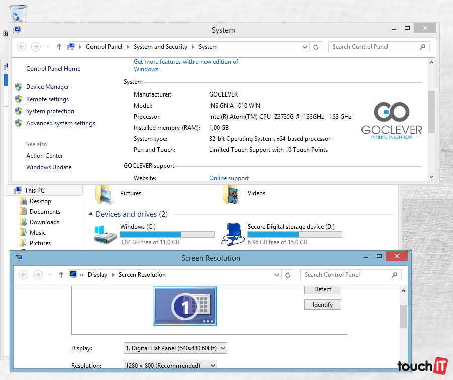 GoClever INSIGNIA 1010 WIN má 10-palcový displej s rozlíšením 1280 × 800. Ide o IPS obrazovku, takže pozorovacie uhly sú na veľmi dobrej úrovni. Kvalita displeja je dobrá, dotýkať sa môžete maximálne v piatich bodoch súbežne. Kus, ktorý sme mali k dispozícii na testovanie, mal na obrazovke jeden mŕtvy pixel. Bol viditeľný iba za určitých podmienok. Tablet poháňa procesor Intel Atom Z3735G so štyrmi jadrami a frenkvenciou 1,33 GHz. Tento procesor bol použitý aj v 8-palcových modeloch, ktoré prišli na trh koncom minulého roka.