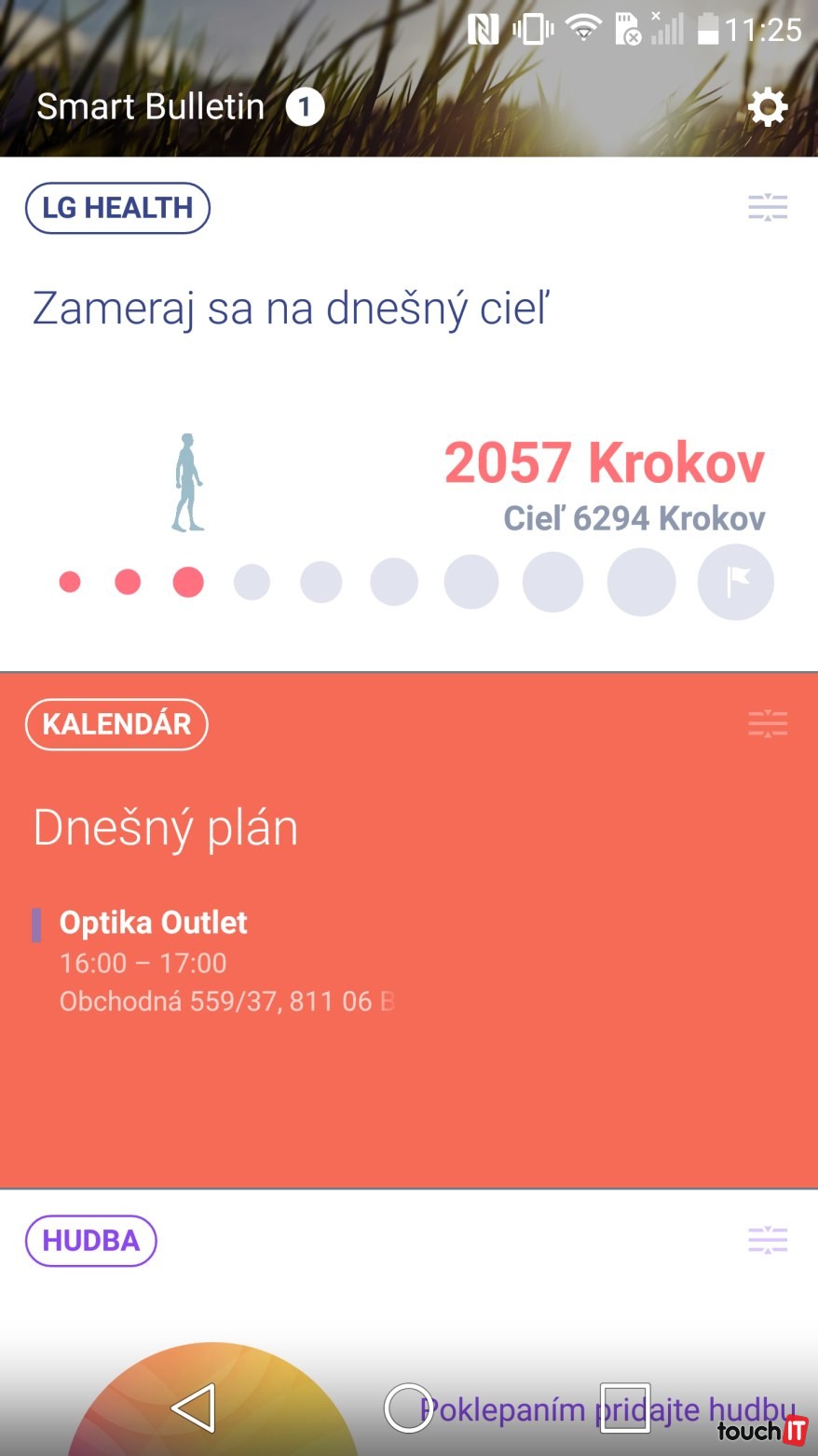Nám sa páčila aj funkcia Smart Bulletin. Iste mnohí poznáte bočný panel HTC Sense. Tu ide o obdobu panela, ktorý sa zobrazuje ako súčasť domácich obrazoviek. Takisto je uložená úplne vľavo. Má však podstatne zvýšenú funkcionalitu. Začnime hneď možnosťou Smart Settings. Na základe vašej polohy (doma alebo mimo domácej lokality) môžete prepnúť zvukový profil, Bluetooth alebo Wi-Fi. Zároveň je tu integrovaná aplikácia LG Health. Neprekvapí, že ide o krokomer s možnosťou napojenia na hardvérové snímače tlaku, tepla alebo váhy. Nechýba tu kalendár, zobrazovanie prehrávača hudby, QuickRemote a tipy na používanie. Aj keď nemáme príliš radi rôzne panely tohto typu, tento sa nám páčil. Je previazaný so systémom a nejde len o RSS čítačku s naskladanými widgetmi. Mimochodom, aj tu je rozdiel oproti iným panelom, RSS čítačka tu nie je. Pri aplikáciách ako Flipboard je to to najmenej.