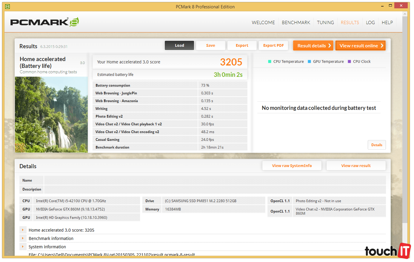 Rôznorodá konfigurácia postihuje takmer všetky komponenty, ktoré sú v notebooku použité. Dizajn a plastová konštrukcia s použitím uhlíkových vlákien sa však nemenia. Takisto ostávajú aj rozmery a hmotnosť. Alienware 13 spolieha na nenápadné telo, ktoré príliš pozornosti nevzbudzuje a neohúri vás na prvý pohľad (a dotyk) tak ako niektorí jeho konkurenti. Nakoľko je to problém, si musí zvážiť používateľ sám. Veku však dominuje menšia lebka mimozemšťana a dva podsvietené pruhy. Podobným spôsobom je zvýraznená aj samotná klávesnica a nápis ALIENWARE pod displejom. Vráťme sa späť ku konfigurácií. Testovali sme model, ktorý je vybavený procesorom Intel Core i5-4210U s taktom 1,70 až 2,40 GHz. Operačná pamäť bola v našom prípade 16 GB a o grafický výkon sa starala dedikovaná karta GeForce GTX 860M. Táto výbava (s výnimkou operačnej pamäte) už dnes nepatrí medzi to najlepšie, čo trh ponúka. Na druhej strane, aktuálna webová stránka produktu umožňuje zostaviť konfiguráciu s procesorom Intel Core i7-5500U a grafickou kartou GeForce GTX 960M. Takáto zostava je samozrejme výkonnostne niekde úplne inde v porovnaní s modelom, ktorý sme mali k dispozícii. Nasledujúce riadky, venované vyhodnoteniu testov, preto berte s rezervou. Alienware 13 si kúpite aj v takej zostave, ktorú sme testovali. Avšak, ak máte dostatok peňazí, postavíte si skutočné „delo„. Notebook sme zaťažili v hrách samotných, ale aj pomocou overených nástrojov. Za zmienku stojí výsledok testu Fire Strike v aktuálnej edícii programu 3DMark. Alienware získal 3079 bodov, čo je podľa spoločnosti Futuremark o trochu menej, ako by mal dnes dosahovať herný notebook. Pre porovnanie, konkurenčný herný notebook nazbieral v tomto teste až 8438 bodov (s procesorom Intel Core i7-4860HQ a grafickou kartou NVIDIA GeForce GTX 980M). Spomeňme 1458 bodov v Extreme teste 3DMarku 11 a 3205 bodov v PCMarku 8.