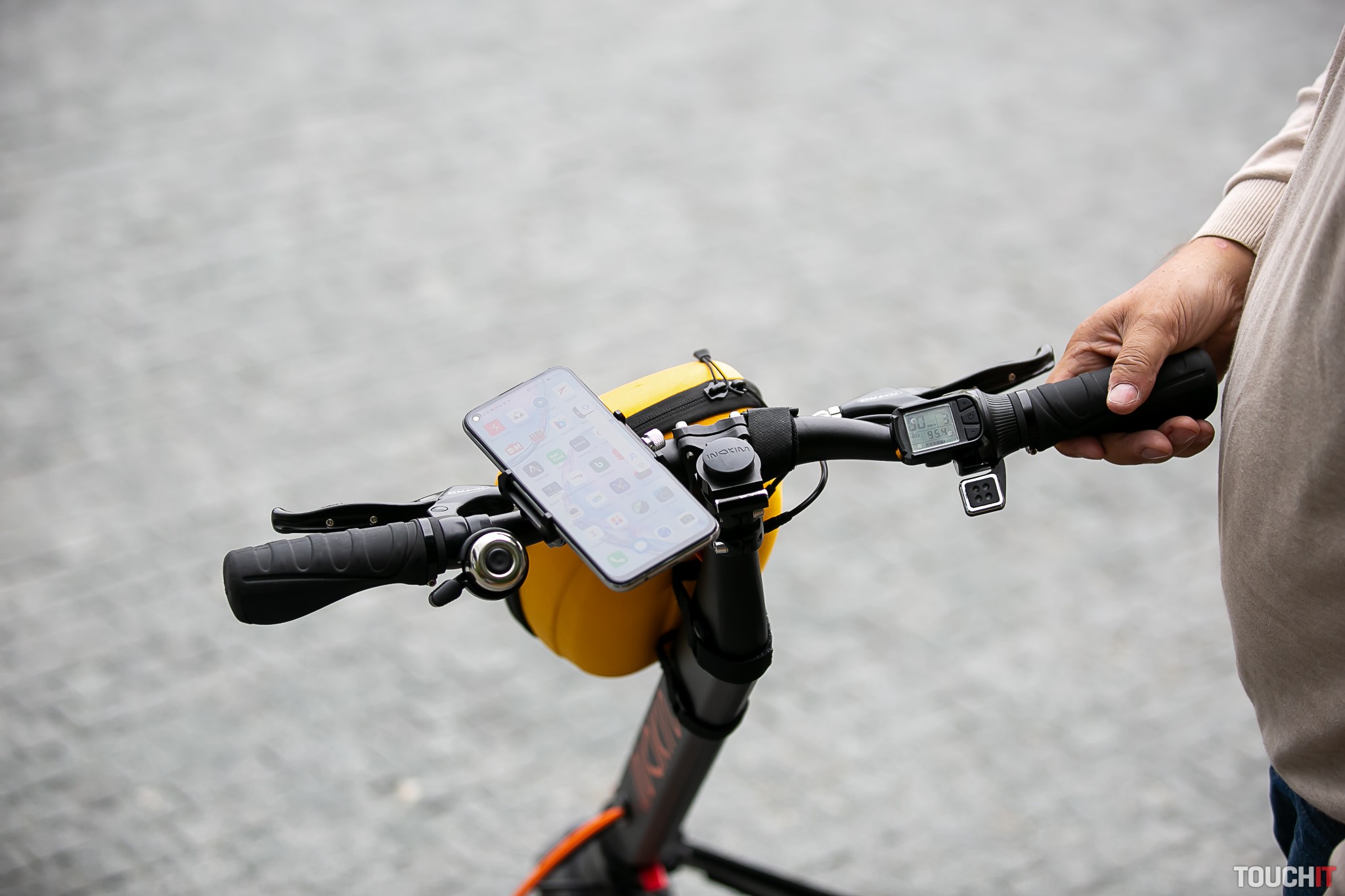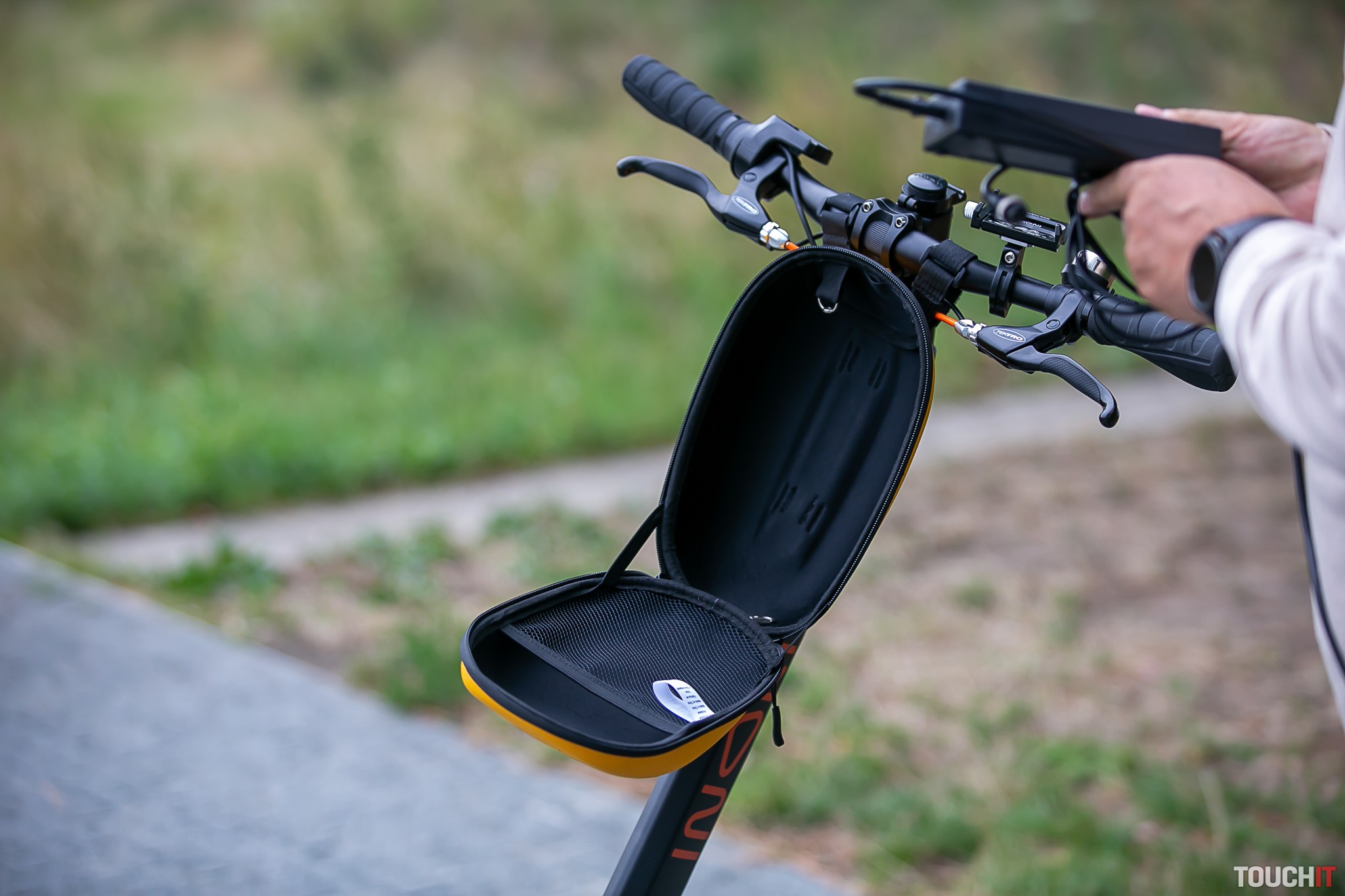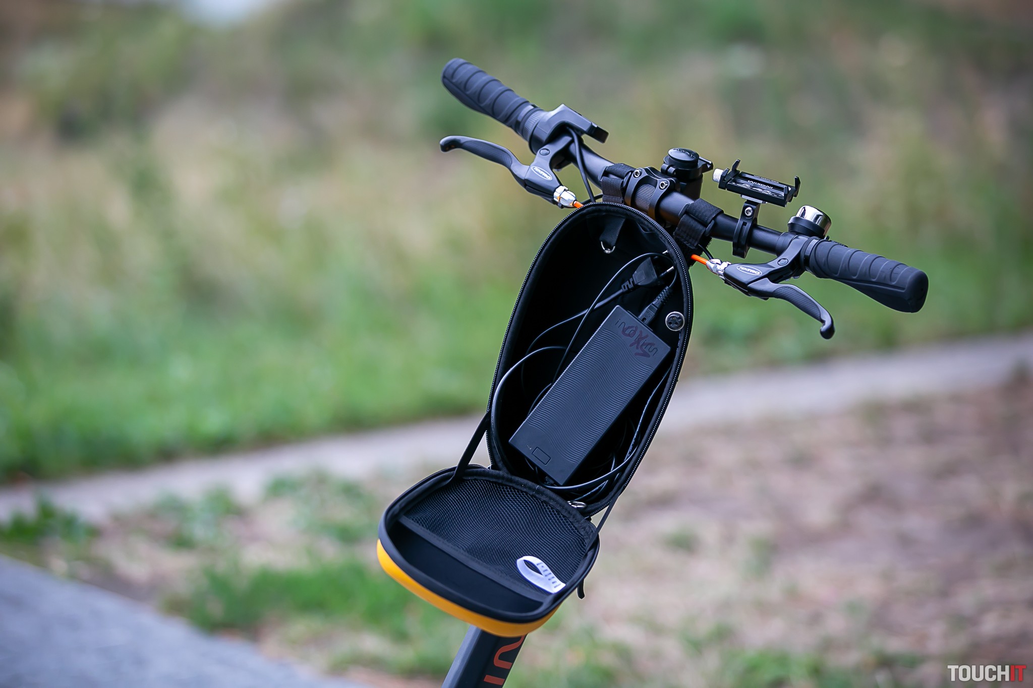 My sme mali k tejto kolobežke navyše požičanú aj tašku na príslušenstvo, sem sa zmestí celá nabíjačka a na volante sme mali namontovaný aj extra stabilný držiak na mobil.