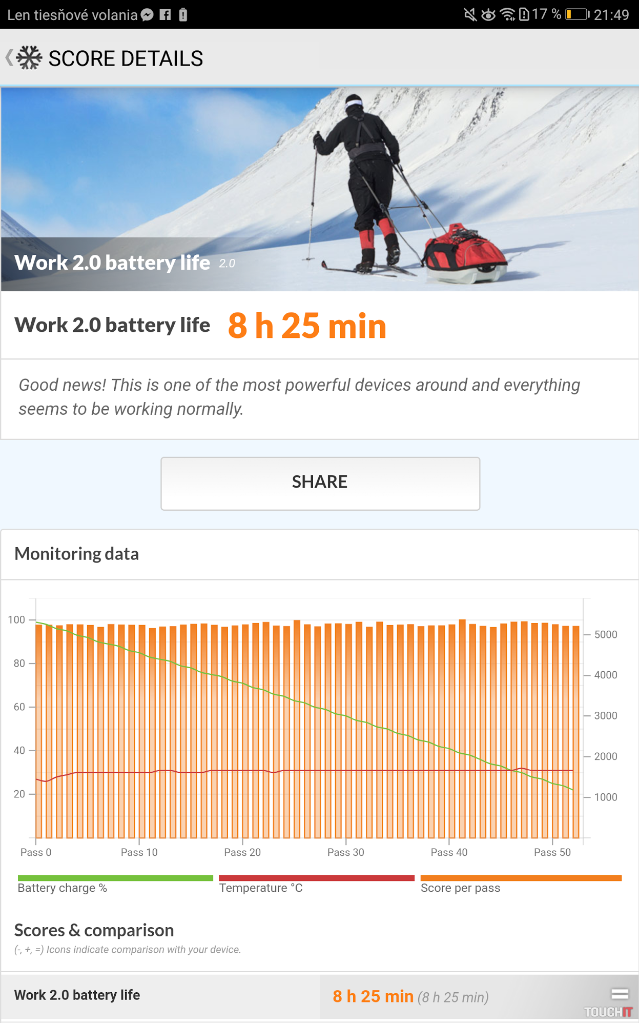 Tablet má vo výbave micro USB konektor a 3,5 mm jack. Dnes by sme už očakávali zabudovanie USB-C portu. V prípade LTE verzie je vo výbave aj slot pre nano SIM kartu. Batéria má kapacitu 5100 mAh, čo je o 300 mAh viac v porovnaní s predchodcom. Výdrž batérie je dobrá, v testoch PCMark Work battery life sme namerali 9,5 hodiny. V prípade PCMark Work 2.0 je výdrž 8,5 hodiny. Výrobca udáva výdrž až 11 hodín prehrávania videa. Chválime aj hrúbku zariadenia, iba 7,3 mm. Fotoaparáty vo výbave tabletov obvykle bližšie nehodnotíme. Huawei v prípade novinky však chválime za to, že predná aj zadná kamera majú rozlíšenie 8 Mpx. Tá zadná ponúka aj automatické zaostrovanie. Z praktického hľadiska však očakávame, že viac oceníte 8 Mpx prednú kameru, a to pre potreby aplikácií ako je Skype. Huawei chválime aj za rozumne nastavenú cenu. Wi-Fi verzia sa predáva za 329,90 eura, LTE verziu nájdete napr. v ponuke Orangeu. Operátor pri LTE verzii tabletu uvádza cenovku 365 eur. Pomer cena/výkon je veľmi dobrý a v tejto cenovej kategórii dnes nič lepšie nenájdete. Jedinou alternatívou je o trochu starší Samsung Galaxy Tab S2. Cena: od 329,90 EUR / 365 EUR testovaná konfigurácia Zapožičal: Huawei [pricemania_product_prices product_id=“6992125″][/pricemania_product_prices] Plusy + Pomer cena/výkon + 8,4-palcový displej + Snímač odtlačkov prstov s extra funkciami + 8 Mpx predný fotoaparát Mínusy – Iba micro USB konektor