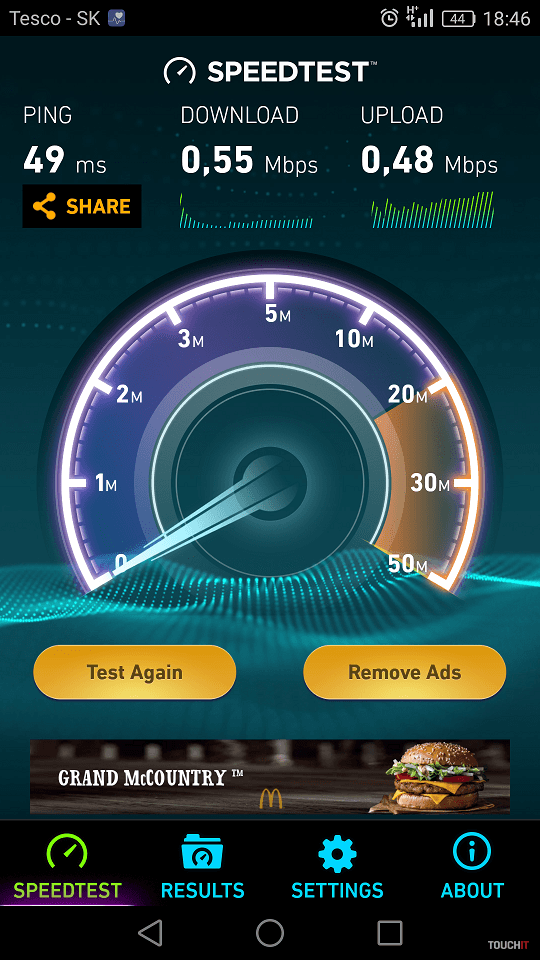 V meraných lokalitách sme dosahovali veľmi dobré výsledky kvality signálu. Takmer všade bol signál plný, občas polovičný. Telefonovanie bolo bezproblémové počas celého testu a aj tam, kde majú iní operátori nedostatok. Z hľadiska pokrytia mobilným signálom a kvality telefonovania sme boli spokojní a nemáme čo operátorovi Tesco mobile v daných lokalitách vytknúť. Režim siete bol v 90 % – 3G (HSPA+)