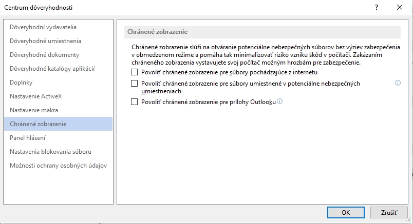 Tlačidlom Nastavenia centra dôveryhodnosti zobrazíte Ďalšie okno a v zozname je položka Chránené zobrazenie. Tu deaktiváciou všetkých troch položiek vypnete upozorňovanie, že súbor pochádza z internetu (aj emailovou cestou) a bude sa zobrazovať v režime úprav s plným zobrazením panela nástrojov.