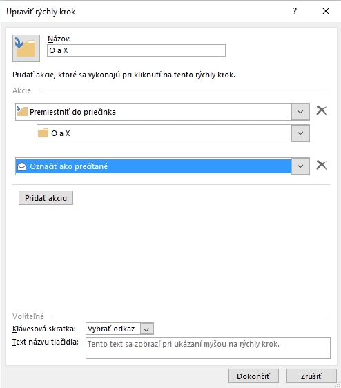 Na paneli Domov je v sekcii Rýchle kroky tlačidlo Vytvoriť nový. V zobrazenom okne postupne vyberáte akcie, ktoré chcete vykonať kliknutím na nové tlačidlo v uvedenej sekcii. My tento systém používame napríklad na presunutie správ do priečinkov od vybraných odosielateľov. Je to rýchlejšie ako ťahanie správ a púšťanie na vybrané priečinky. Zároveň máme nastavené, aby sa takéto správy označili ako prečítané.