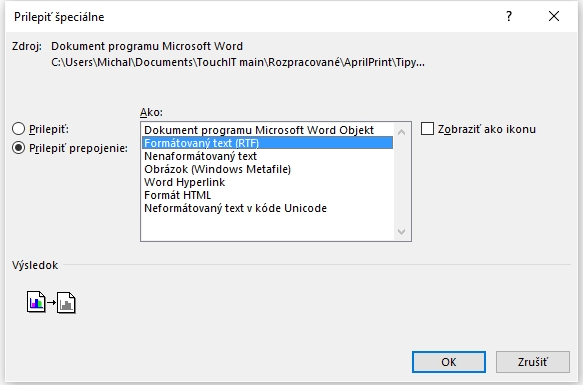 Text, ktorý chcete aktualizovať skopírujte. Následne kliknite na tlačidlo Prilepiť – Prilepiť špeciálne. V zobrazenom okne je treba vybrať voľbu prilepiť prepojenie a vybrať formát textu. Ak ide o obyčajný štýl písma odseku, pokojne stačí vloženie formátovaného textu RTF.