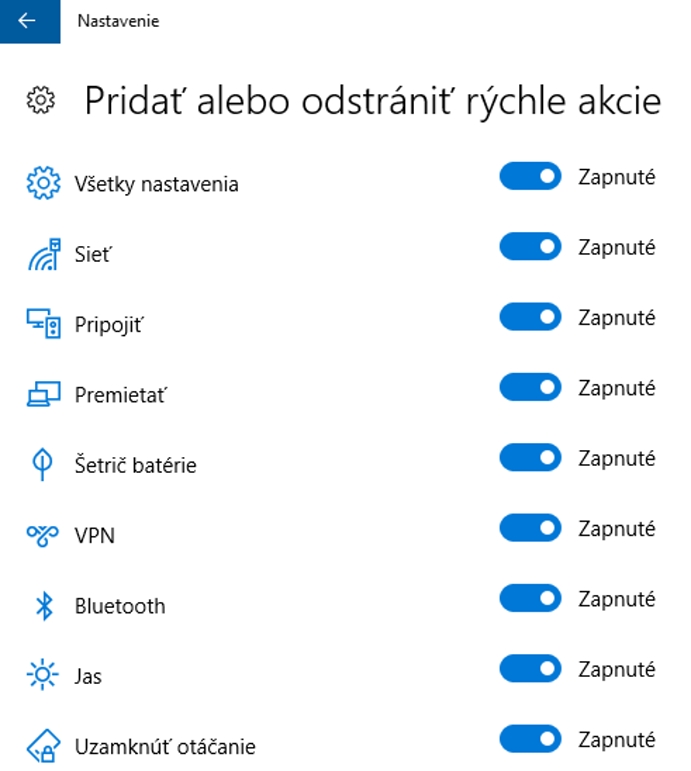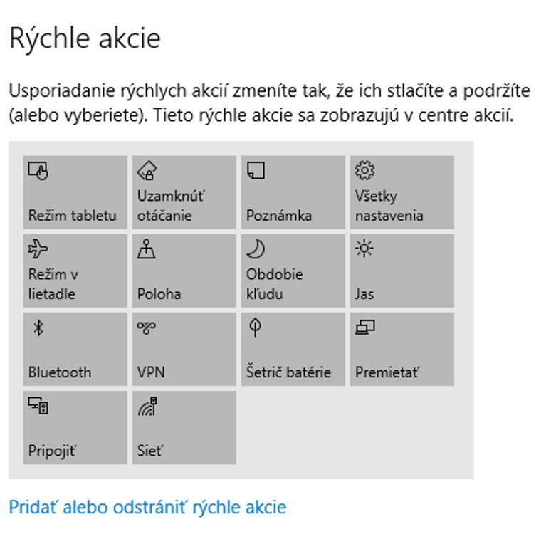 Centrum akcií poskytuje rýchle voľby k zapnutiu alebo vypnutiu režimu tablet, režimu v lietadle alebo napríklad Bluetooth či kontrolu jasu. Rozmiestnenie položiek sa dá zmeniť podľa seba alebo ich počet zredukovať. Na to, aby sme ich usporiadali podľa seba je treba v časti Nastavenie – Systém – Oznámenia a akcie zmeniť poradie položiek uchopením myši a potiahnutím na nové miesto. Odkaz Pridať alebo odstrániť rýchle akcie zobrazí zoznam všetkých dlaždíc s predvoľbami. Tu ich môžete skryť. Vhodné vtedy, keď veľa z nich priamo nepoužívate a zbytočne vám zavadzajú.