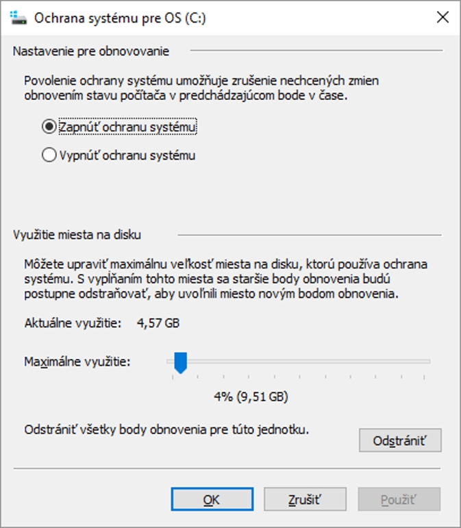 Operačný systém je štandardne nastavený tak, aby si robil zálohu konfigurácie a kritických súčastí vtedy, keď funguje správne. Ak sa niečo pokazí, napríklad po inštalácii nejakého programu alebo neodbornom zásahu do registrov, je tu možnosť obnovy. No Windows 10 funguje zväčša veľmi dobre a len málokedy sa k týmto bodom treba vrátiť. V čase, keď máme mnohí SSD disky s kapacitou „tak akurát“, nám ale tieto body obnovenia zaberajú miesto.