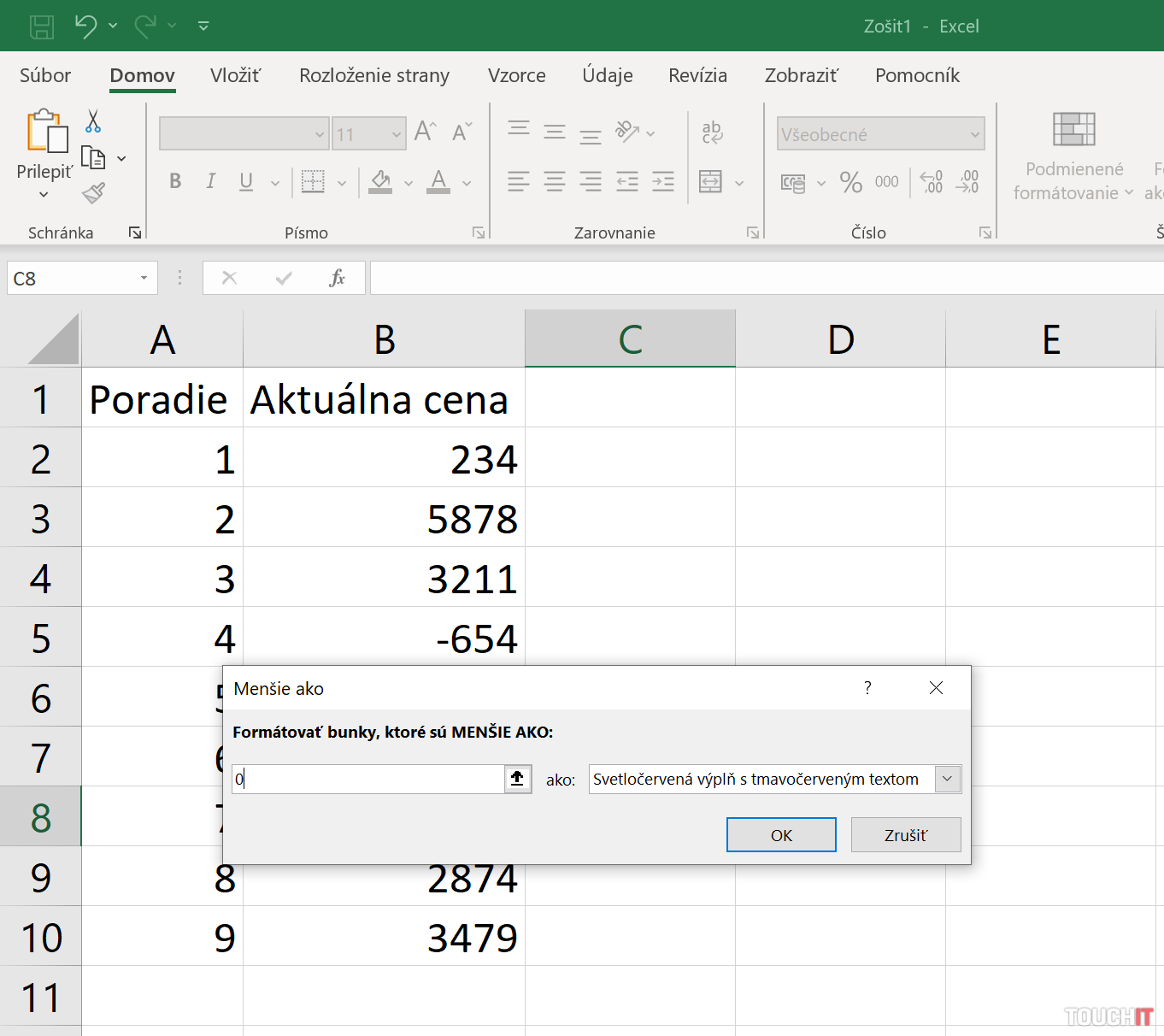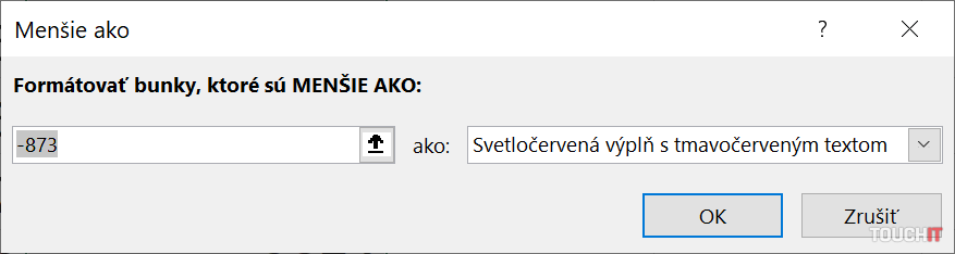 V zobrazenom okne prepíšte hodnotu na 0 a potvrďte ho. Týmto sa okamžite zafarbia bunky so zápornou hodnotou na červenú farbu. V rámci nastavení sa dá prispôsobiť, ako bude odlišné formátovanie vyzerať. Napríklad necháte bunky bez výplne, avšak zmeníte formát písma na červenú farbu.