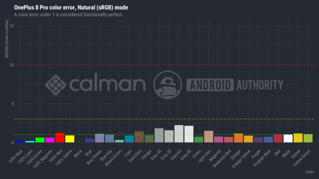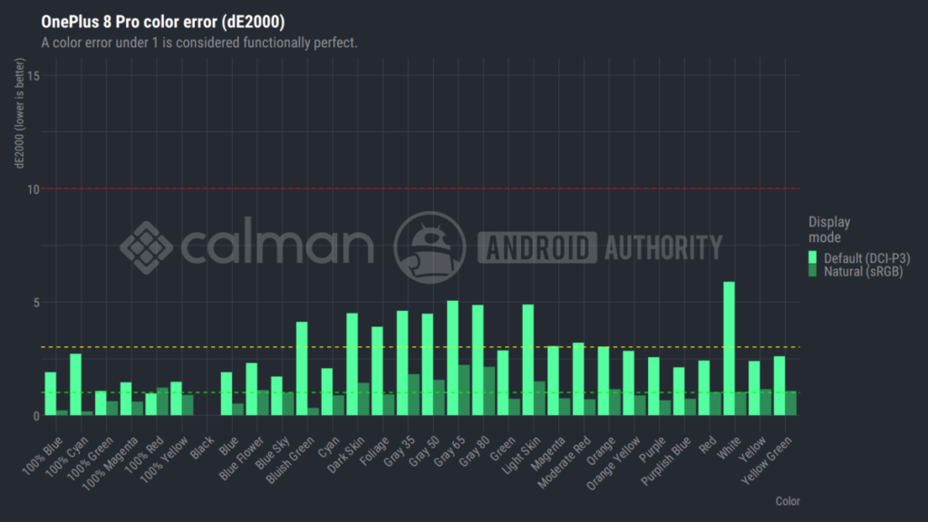 OnePlus 8 Pro ponúka vo svojom predvolenom režime zobrazenia výnimočne nízku priemernú farbu deltaE2000 2,86. Tým sa dostaneme veľmi blízko k prahu, kde je ťažké vidieť chyby obrazovky (deltaE2000 2.0) a tiež do oblasti s veľmi vysokým výkonom. Je to kvôli dodatočnej kalibrácii, ktorú OnePlus vykonal na Amoled paneli, čím prekonal predvolené výrobné nastavenia. OnePlus 8 Pro prináša výhody vyváženia bielej farby, ktorá nie je ani príliš teplá ani studená. OnePlus skutočne urobil výnimočnú prácu s displejom modelu 8 Pro, hoci nie je dokonalý. Rovnako nie je ideálna Gama krivka displeja.Chyba farby obrazovky OnePlus 8 Pro