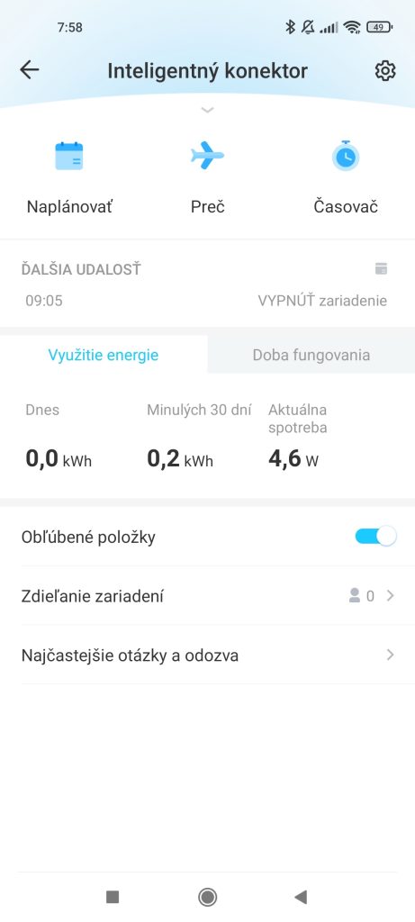 Keď sa povie inteligentná zásuvka, znie to dobre, zároveň je ale vhodné nájsť správny spôsob využitia. Tu je dôvod navyše a to práve meranie spotreby elektrickej energie. To sa mi páčilo asi ešte viac, ako možnosť vypnúť ju a zapnúť na diaľku. Samotná zásuvka má spotrebu 1,2 W, ktorú som si nameral samostatne. V niektorých prípadoch šetrenie nemusí byť primárny motív ale mať istotu, že je určitá vetva eklektického okruhu vypnutá.