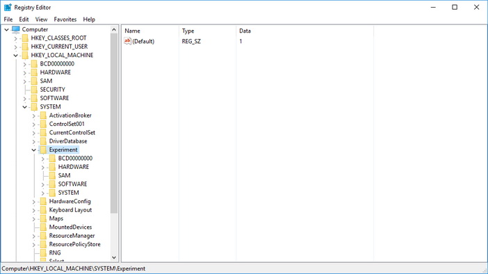 Prepíšeme adresu všetkých vetiev tak, aby namiesto HKEY_LOCAL_MACHINE/podvetva dostali adresu HKEY_LOCAL_MACHINE/System/Experiment. Inak povedané, do zrejme najdôležitejšej vetvy registra importujeme o úroveň nižšie kompletnú kópiu celej vetvy.