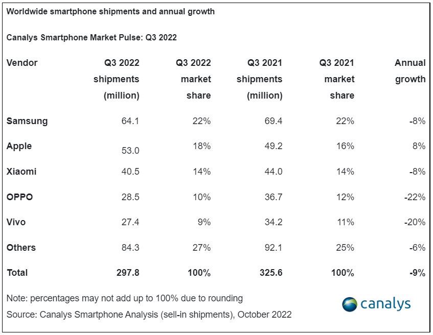Celkovo výrobcovia v treťom kvartáli dodali na trh 297,8 milióna kusov smartfónov. Prvú pozíciu v rebríčku najväčších výrobcov si drží Samsung, ktorý vyexpedoval 64,1 milióna telefónov a získal tak na trhu podiel 22 %. Na druhom mieste je Apple s 53 miliónmi kusov a 18 %.