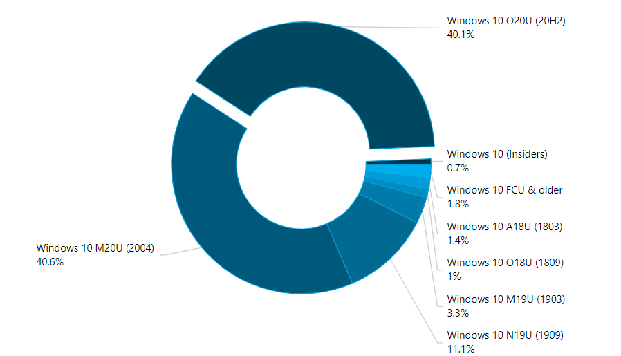 Analýz sa venoval aj server WinAero. Podľa najnovších informácií je sa podiel verzie 20H2 vyšplhal až k 40 % inštalácií. To už je zhruba približný údaj, ako má verzia 2004.