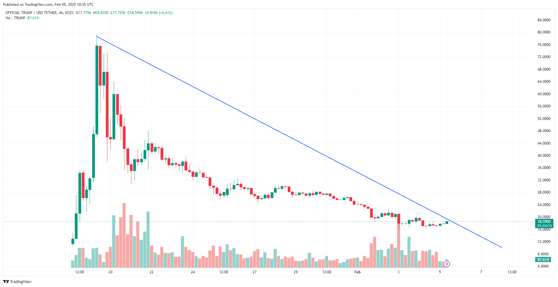 Reálne neprináša žiadny úžitok, no vydanie americkým prezidentom vzbudilo u ľudí záujem. Pre tých čo sledujú grafy, je vidieť, že coin sa v čase písania tohto článku snaží preraziť trendovku smerom nahor. Ide o 4-hodinový graf. Doteraz sme videli iba pokles s jemnými záchvevmi nárastov, no trendovku sme nepreliezli.