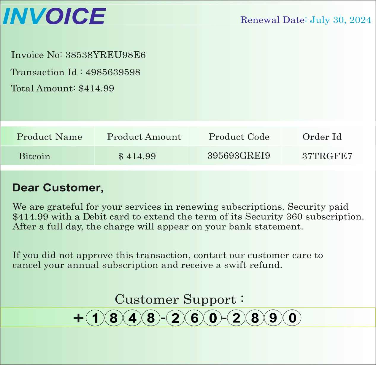 Posledný prípad s Bitcoinom prebieha v čase, keď jeho suma dosahuje 70 000 USD. V zdanlivej faktúre nie je takáto suma, požadovaných je len cez 400 dolárov, ktoré treba zaplatiť za Bitcoin. Ani tento údaj veľmi nesúhlasí, keďže ďalej v popise sa uvádza platba za bezpečnostné riešenie Security 360. Zrejme zvolené na ľahké zamenenie za skutočný produkt Norton 360.