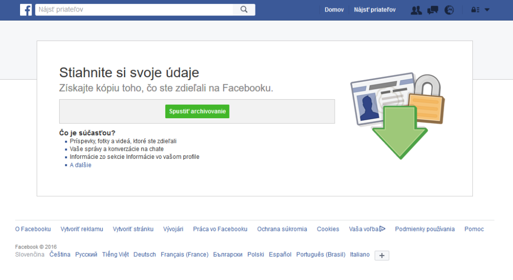 Ak potrebujete svoje fotky a ostatné dáta stiahnuť z Facebooku, môžete to urobiť poľahky hromadne kliknutím na rozbaľovacie menu v tvare trojuholníka v pravom hornom rohu rozhrania. Vyberte Nastavenia a v časti Všeobecné nastavenie účtu zbadáte dole na spodku ponuku Stiahnite si kópiu svojich údajov z Facebooku.