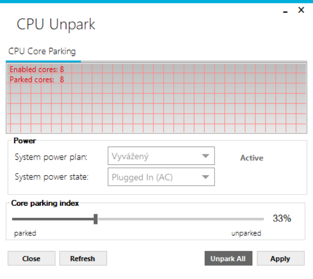 Čím menšie percento v nastaveniach Core parking index, tým skôr sa odstavia jadrá a HT vlákna CPU. Pri vyššom výkone ich ale systém bude môcť opätovne využiť.
