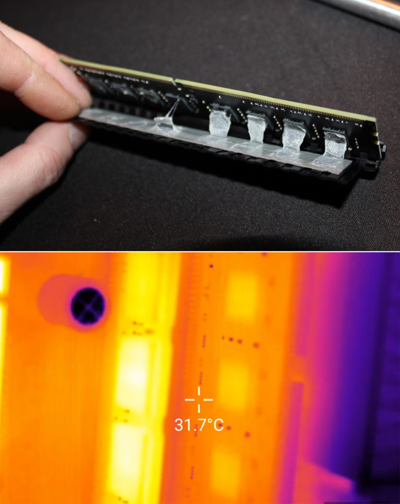 Nie je to pravdaže prípad každej pamäte. Merania tohto druhu sa však robia veľmi zle, pretože chladič býva na pamäť silno prilepený, takže pri jeho odstraňovaní hrozí poškodenie čipov (trhnutím, alebo vysokým zahriatím potrebným na roztavenie lepidla). Je lepšie to teda nerobiť.