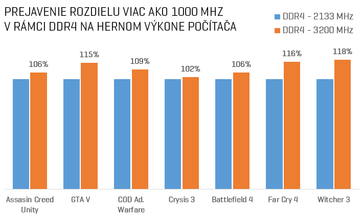 Všetko pravdaže závisí od druhu vykonávanej úlohy a takisto aj type procesora, avšak v základe počítajte s tým, že v náročných úlohách, ako je napríklad hranie hier, bude rozdiel medzi nižšie taktovanou DDR4 s frekvenciou 2133 MHz a vysoko taktovanou DDR4 s frekvenciou 3200 MHz zhruba 10 % (teda napr. 60 FPS vs. 66 FPS). Niekedy trošku viac, často aj o dosť menej. To pravdaže platí len pre náročné úlohy. Pri bežnej práci s Windows nenameriate výkonový rozdiel žiadny.