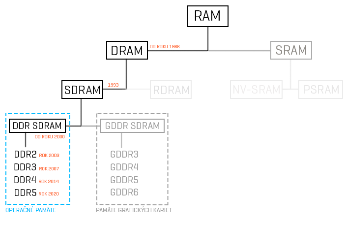 Pozícia DDR SDRAM v RAM hierarchiiRýchly prehľad: Nech už e-shop či stránka výrobcu zobrazí akékoľvek z týchto základných označení (RAM, SDRAM a DRAM), nemusíte si ich vôbec všímať. V tomto označení sa nedá pomýliť. Ak ste v sekcii pamätí pre počítače, ste na správnom mieste. ALE POZOR. Jediné čo vás zajíma a čo je dôležité, je označenie generácie. Ide o DDR(nejaké číslo). Súčasné počítače používajú DDR4. Pre tie staršie desktopy a notebooky budete musieť vyberať DDR3 či DDR2.