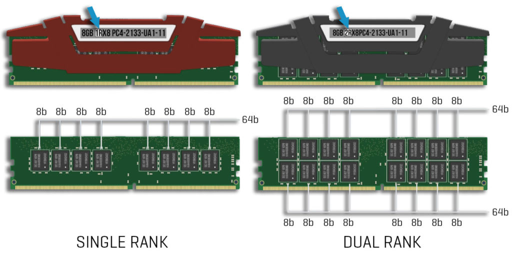 Z pohľad elektrického a technického princípu je však len malý rozdiel medzi dvoma 1 rankovými DIMM modulmi pamäte zapojenými do dvoch slotov a jedným DIMM modulom 2 rankovej pamäte v jednom slote.