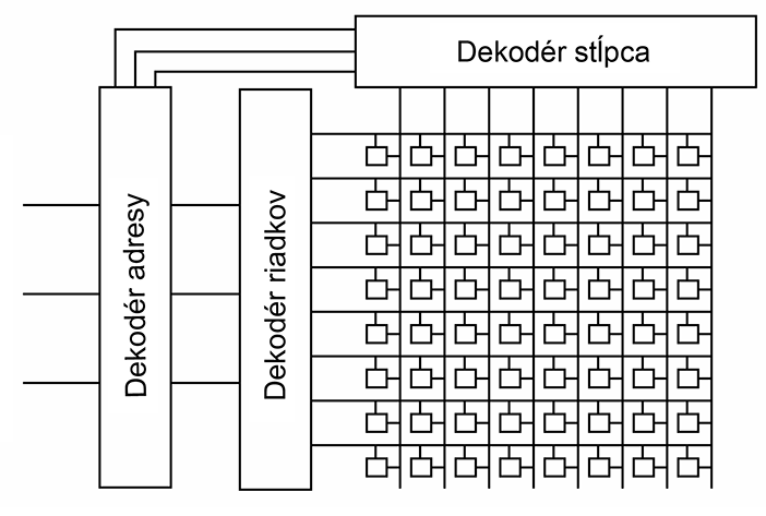 Radič pri tom najprv zopne riadok pamäťového čipu pomocou signálu RAS (Row Address Strobe), teda impulzu na výber riadku a následne pozíciu lokalizuje vyslaním signálu CAS (Column Address Strobe), čo je impulz pre vybratie stĺpca. Tým dôjde k prečítaniu bunky, v ktorej sa signál prekrižuje a odoslaniu dát z bunky do zbernice. Pokiaľ ide o zápis, z radiča ešte putuje signál WE (Write Enable – povolenie zápisu), ktorý sa aktivuje spoločne s CAS, pričom sa v danej bunke dáta naopak zapíšu.