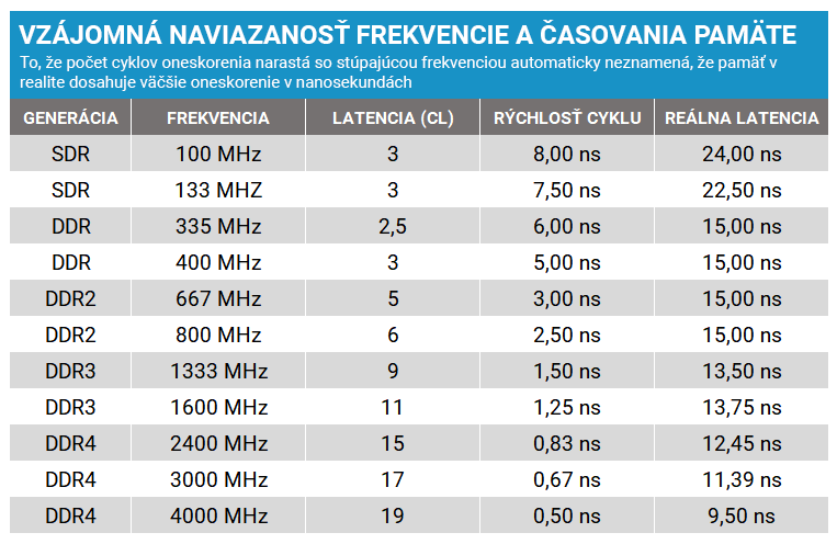 Čím nižší je počet cyklov na vykonanie tejto úlohy, tým je pamäť rýchlejšia. Tu ale presne vidíte, ako je latencia naviazaná na frekvenciu. Nezávisí totiž iba na tom, koľko cyklov na vykonanie operácie treba. Záleží aj na tom, ako rýchlo sa cykly robia.