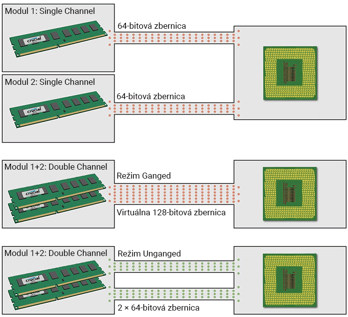 Aktiváciu duálneho zapojenia vyvoláte zapojením dvoch rovnakých modulov do správnych slotov. Na to, či majú byť vedľa seba alebo na „preskačku“ vám odpovie len manuál konkrétnej základnej dosky. Rovnaká farba slotu nie je zárukaTechnický prehľad: Zbernica a radiče pamätí umožňujú zapojenie pamäťových modulov do samostatného režimu, označovaného ako Single channel, ďalej duálneho režimu, označovaného ako Dual channel a niektoré architektúry (high-end alebo serverové CPU ako Intel Xeon či AMD Threadreaper) aj do trojitého a štvoritého, respektíve troj- a štvorkanálového režimu.