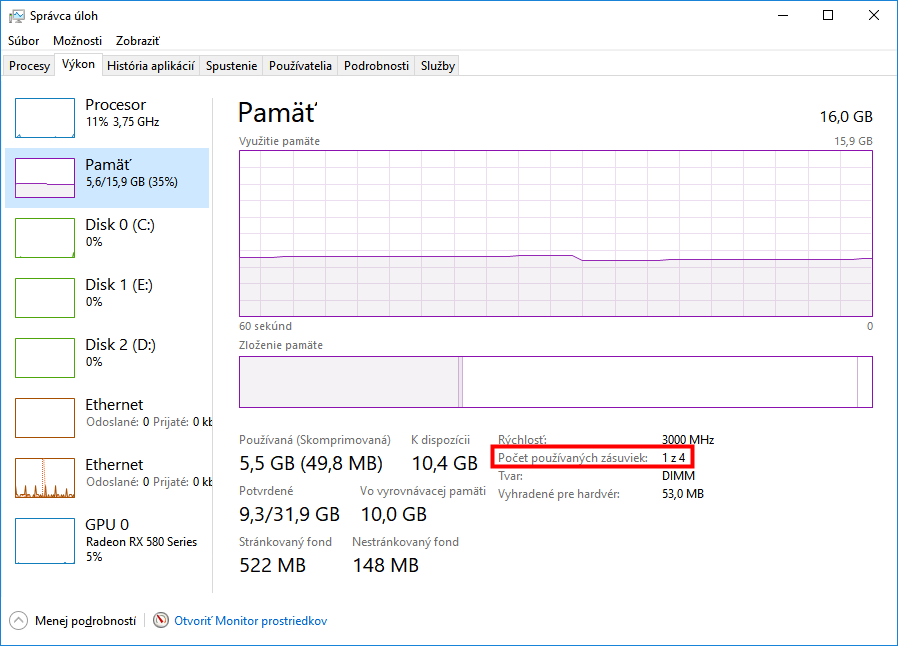 Počet slotov (voľných aj zabraných) môžete zistiť buď pohľadom na samotný hardvér dosky, alebo aj softvérovo, bez nutnosti otvárania počítača. V rámci Windows 10 stačí zobraziť správcu úloh (CTRL+SHIFT+ESC), kde sa prekliknete na záložku Výkon a následne na položku Pamäť. Počet dostupných slotov pamäte tu nájdete roztomilo preložený ako „počet používaných zásuviek“.