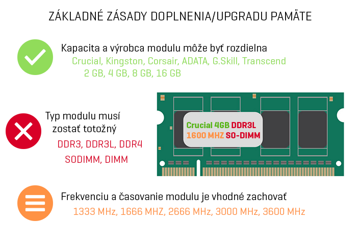 Pri doplnení/upgrade musíte vybrať totožný typ (napr. DDR3) a ideálne aj rovnakú frekvenciu pamäte (napr. 1333 MHz), ako majú tie existujúce moduly. Výrobca a kapacita môže byť odlišná. Môžete tak spolu použiť napríklad 4 GB modul Crucial s frekvenciou 1600 MHz a 8 GB modul Kingston s frekvenciou 1600 MHz.