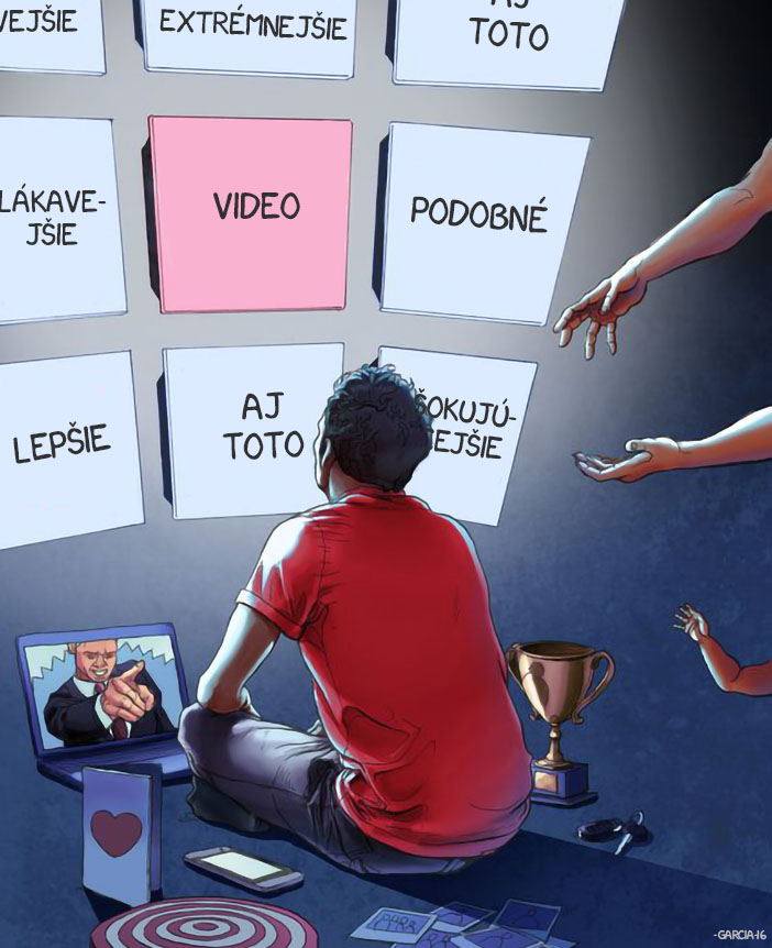 Mechanizmy YouTube sa zo všetkých síl snažia, aby ste na YouTube trávili čo najviac času. O to isté sa snažia neurónové siete a odporúčacie mechanizmy Netflixu, Facebooku a ďalších služieb. Všetci chcú čoraz viac a nikdy nebudú mať dosť.