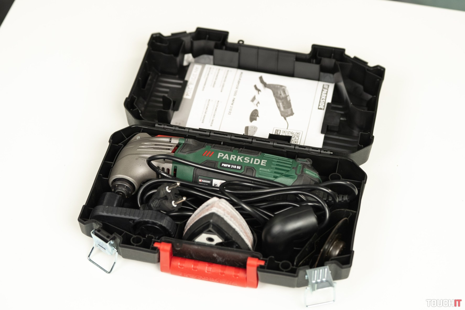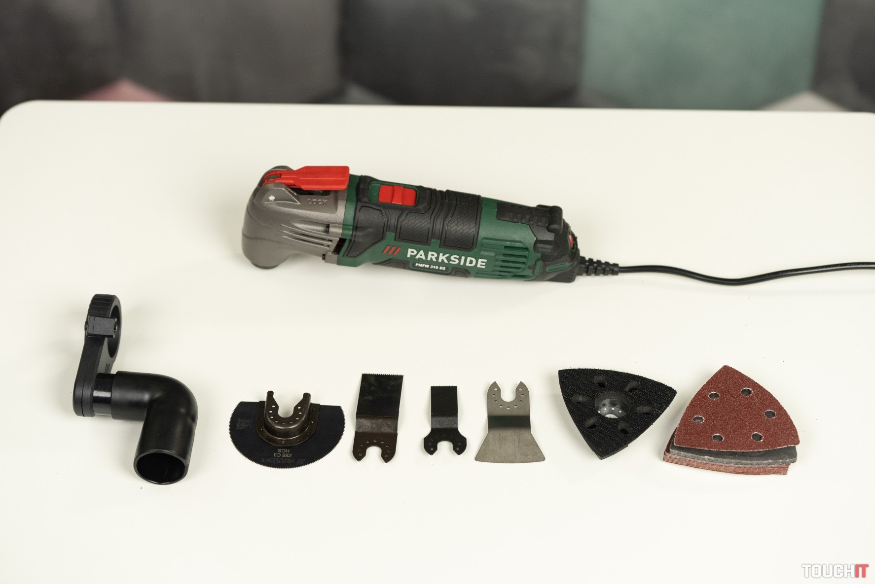 Súčasťou dodávky je aj príslušenstvo: dva pílové listy, jeden segmentový pílový list, škrabka, delta brúsna doska k tomu 18 brúsnych listov a tiež spomenutý adaptér na odsávanie prachu.