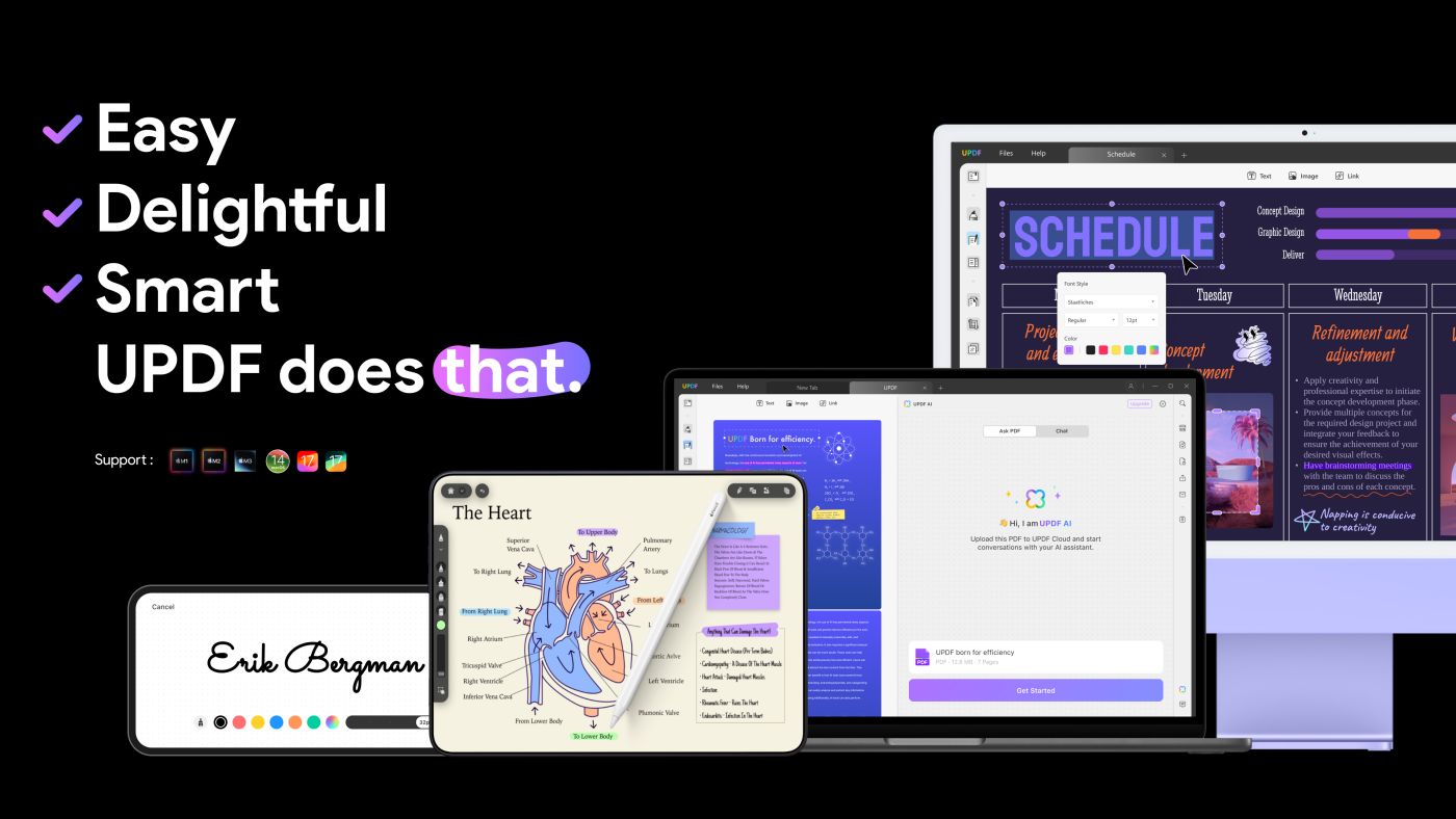 Vzhľad UPDF, „v súlade s dobou“, bez váhania pripomína vzhľad pôvodných a oficiálnych aplikácií Apple a zjednodušuje používanie UPDF. Bohaté farby a premyslené usporiadanie rôznych nástrojov umožňujú používať program aj najmladším alebo starším. A to sú výhody, ktoré sa netýkajú len PC verzie: na mobile je UI prispôsobené malým aj veľkým dotykovým displejom.